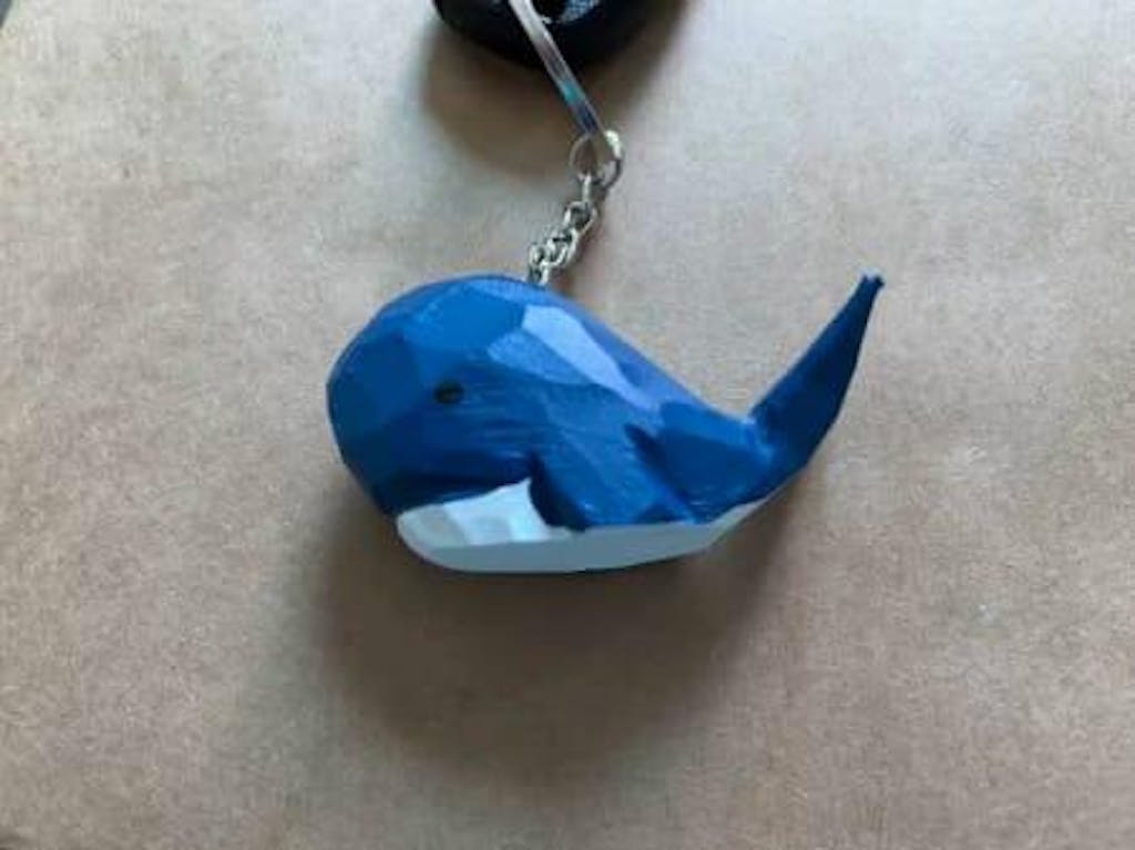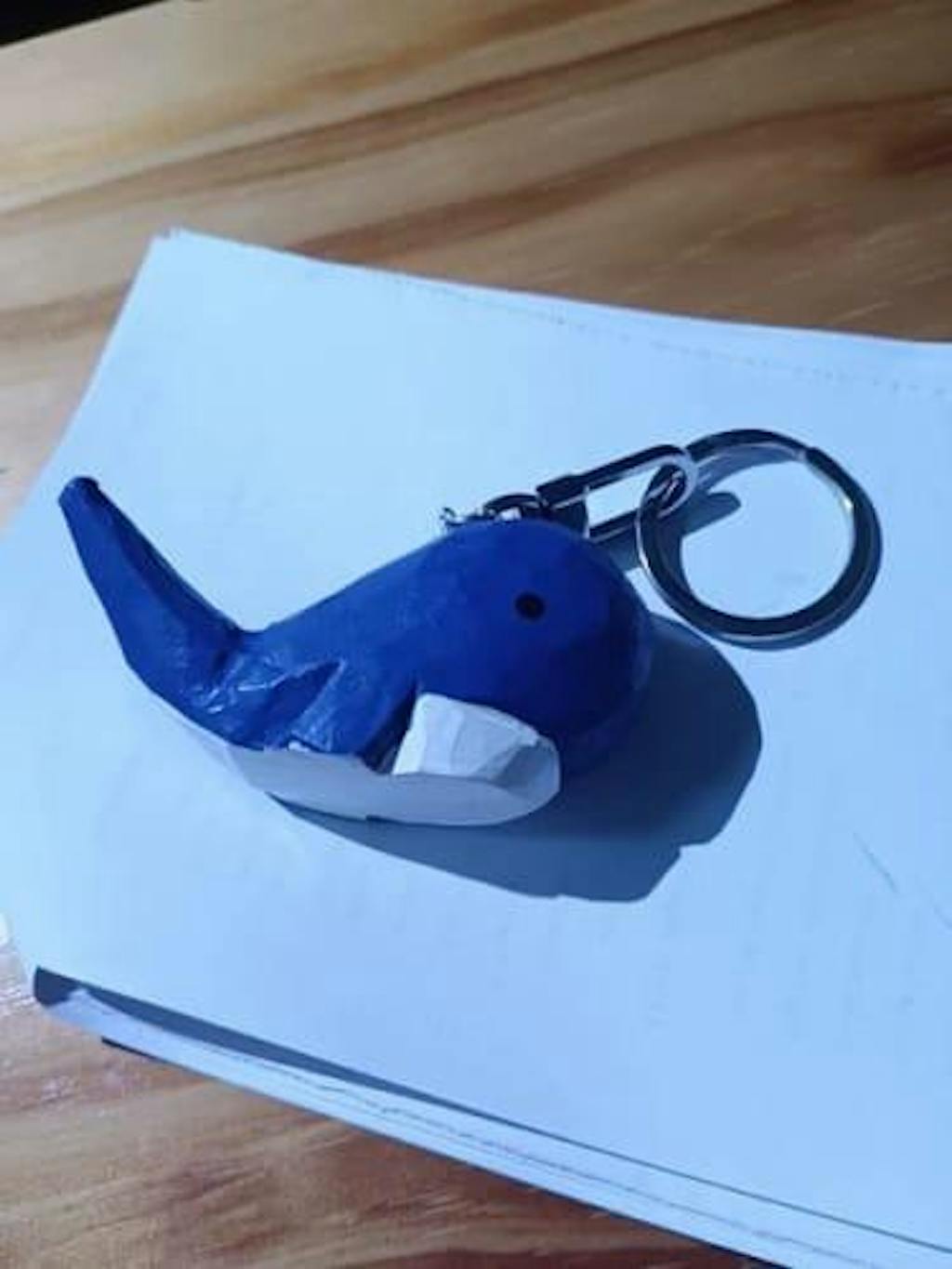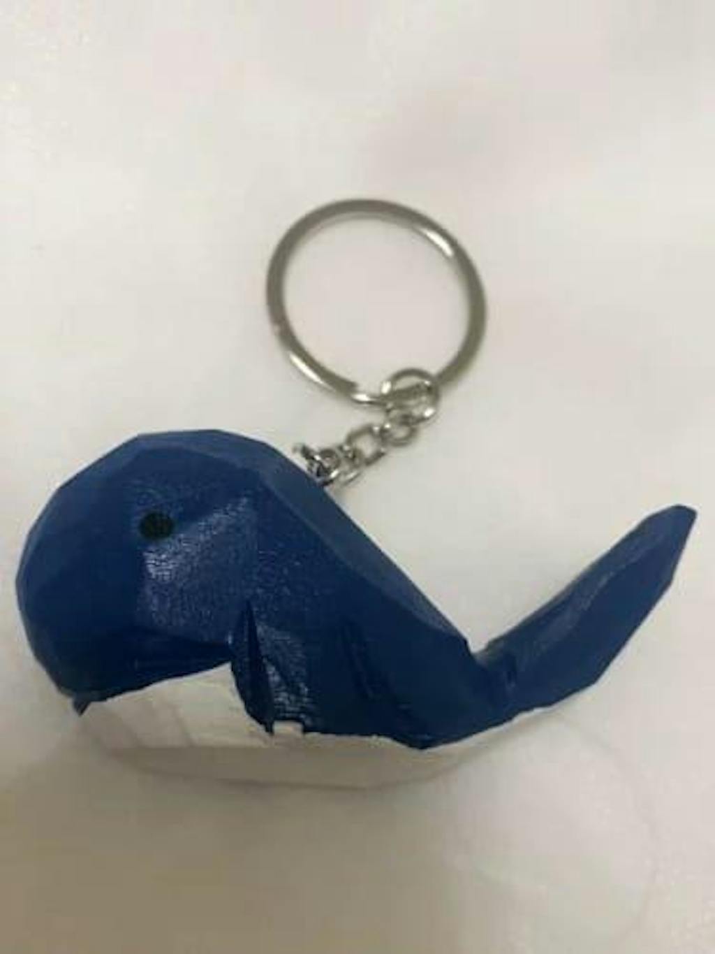 Cartoon style big head blue whale keychain, every angle of the fish's body is deliberately preserved for the engraver. The design was originally intended to emphasize the combination of dark blue and white, representing the color of the deep sea and the traditional white of the fish's belly.