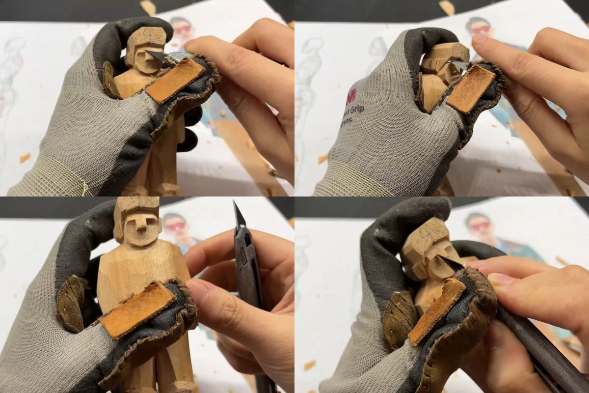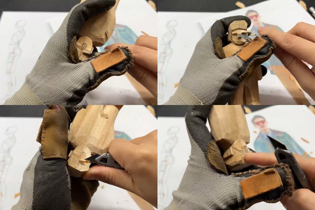 Pick a carving knife with a thinner blade and carve out the slanted line between the sideburn and the face. That creates a height difference. You’ll notice that the carved hairline is still a bit off from the guide we drew earlier—but that’s okay. We need to carve the forehead inward first, then shape the nose height, and from there we’ll get a better sense of where the final hairline should go and what kind of hairstyle the figure will end up with. Be careful not to carve too hard—shave off thin layers one at a time. If you go too deep, you might leave marks that are hard to fix later, and that’ll affect how the finished wooden gift looks.