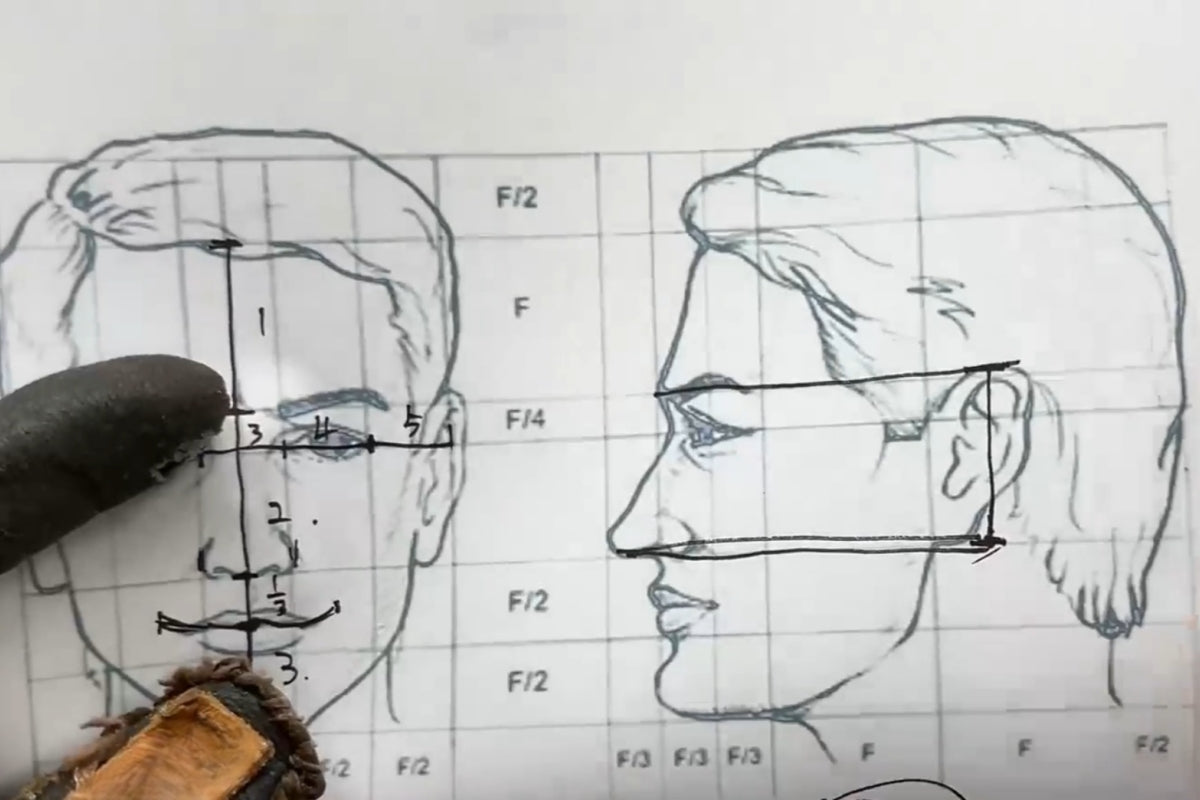 By continuing to carve, the nose, forehead, and cheeks start to become more defined. While you’re at it, you can also clean up the face shape to make both sides more symmetrical. From the front, you might notice that the figure’s nose looks a little wide—go ahead and fine-tune the nose shape a bit.