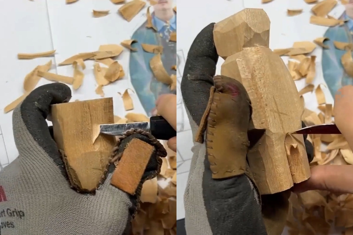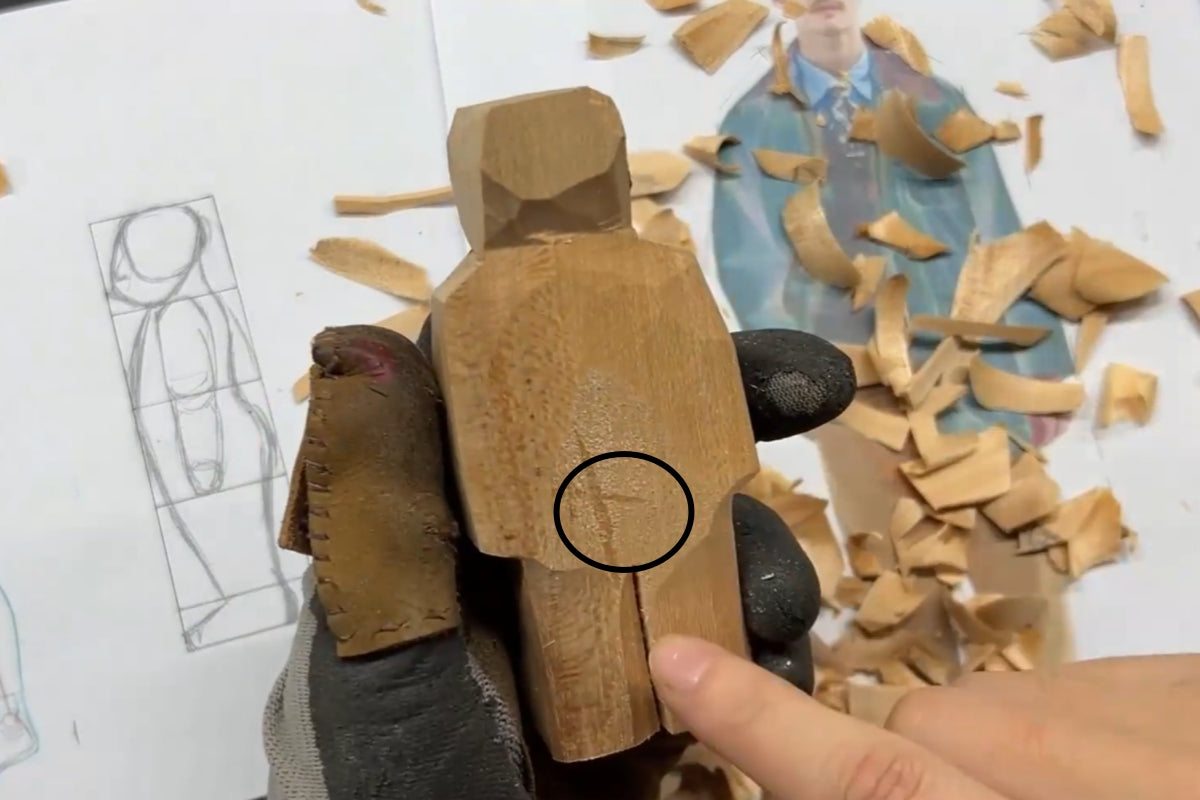 While you’re carving, you might notice that the gap between the legs is still a bit too narrow. In earlier tutorials, we mentioned that people’s feet naturally point outward. To reflect that, you can sketch it out lightly. Remember, the heel is smaller than the ball of the foot, so feel free to draw it a bit exaggerated—it’s just a rough outline for now. After sketching, shave off the extra wood around it with a few thin slices. This helps separate the two feet and makes your figure look more like a real person from a photo. Quick tip here: whenever you’re doing any kind of carving for Svn Futures gifts, be sure to wear gloves or at least put a thumb guard on.